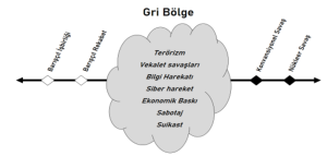 Hibrit savaşın daha iyi anlaşılabilmesi için “gri bölge” ifadesini açıklamak gerekir.[8] Gri bölge, “siyasi hedeflere ulaşmak maksadıyla askerî seçeneklerin uygun olmadığı veya çeşitli sebeplerle uygunsuz görüldüğü alandır.” (Şekil 2). Gri bölgede ise hibrit savaşın kullandığı teknikler ve taktikler yer almaktadır. Gri bölge stratejisinde kurallar yoktur ve sınırlar muğlaktır. Hibrit savaş bu bölge özellikleri üzerine inşa edilmektedir.